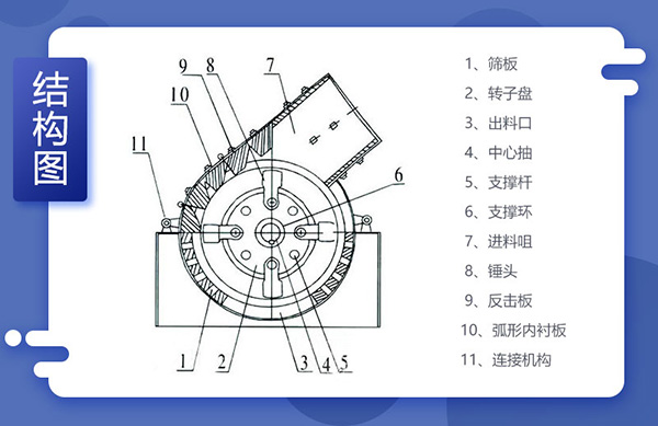 錘式破碎機(jī)箱體、轉(zhuǎn)子、錘頭、反擊襯板、篩板等組成。