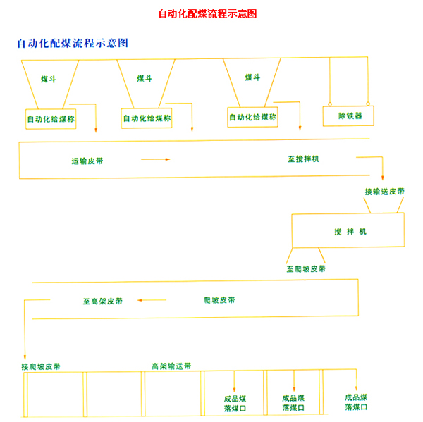 自動配煤流程通常選用2-8種煤經(jīng)進料倉——輸送帶——篩分破碎系統(tǒng)(可選)——特制攪拌機——成品煤輸送皮帶(高架皮帶輸送機)——成品煤